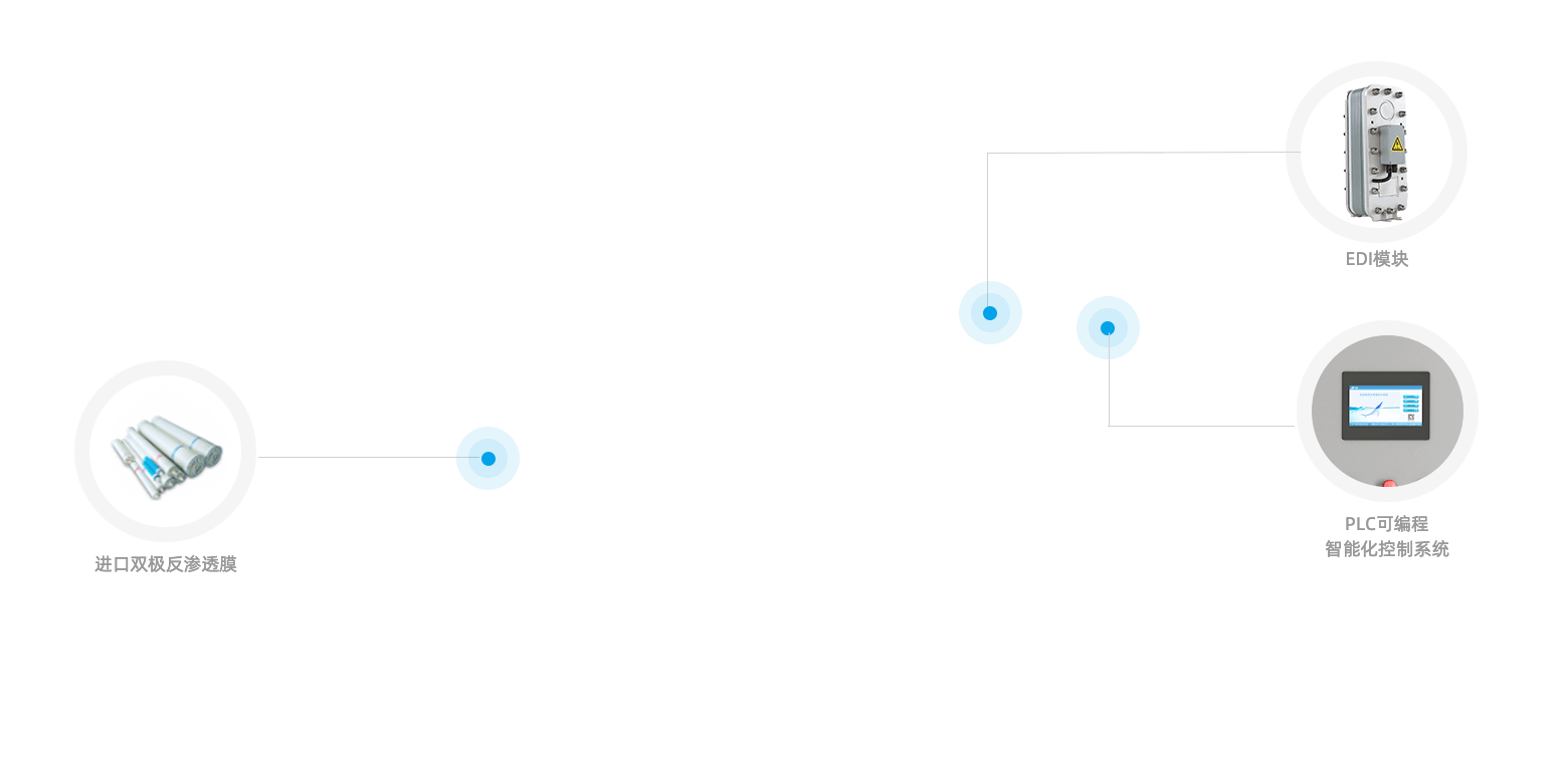 在使用RO滲透水脫除97~99%離子的前提下,EDI可直接將反滲透產(chǎn)水提純到純水、高純水、超純水的標準,而無需使用離子交換混床,其產(chǎn)水的電阻率最高可達18MΩ·cm。