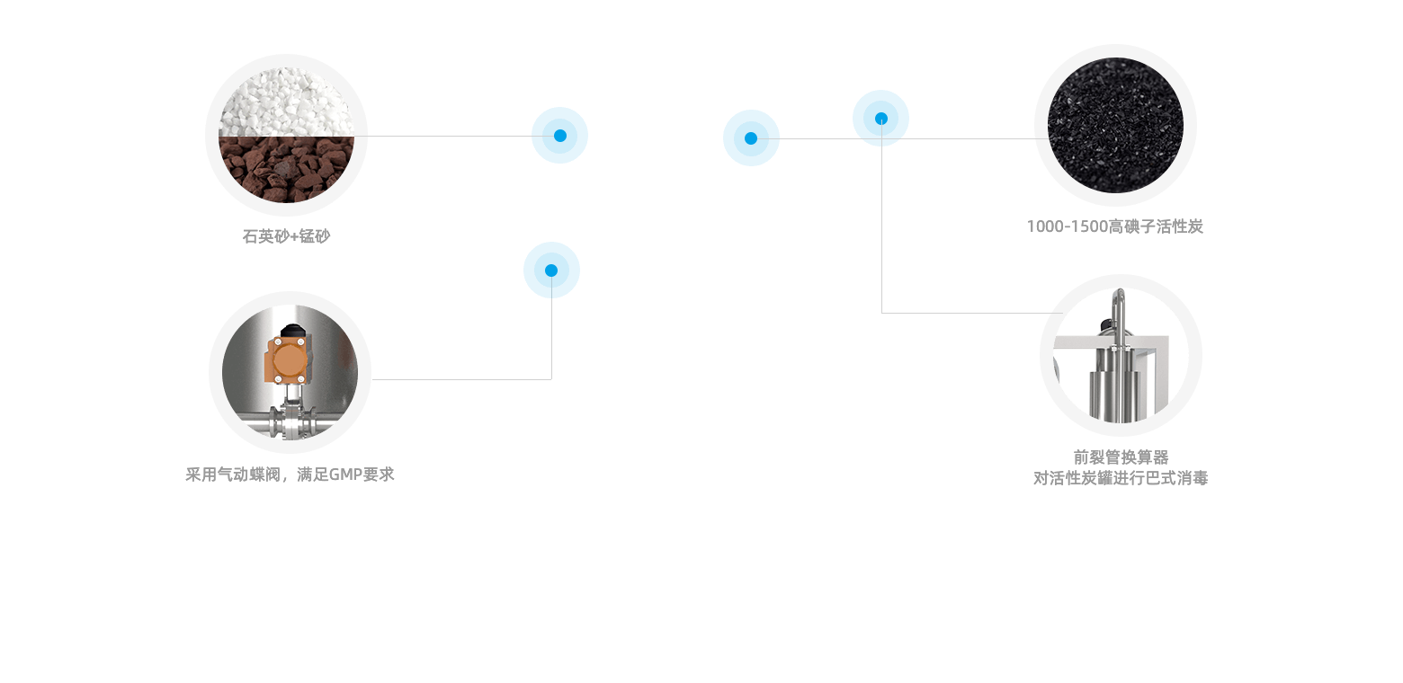即產(chǎn)水合格時產(chǎn)品水通過兩條管線進(jìn)入純化水儲罐,產(chǎn)水不合格時產(chǎn)水通過兩條管線循環(huán)后流回中間水儲罐。純化水儲罐水滿時,亦自動切換至循環(huán)管路運(yùn)行有效地避免了空管的存在,并保證沒有死水存在。